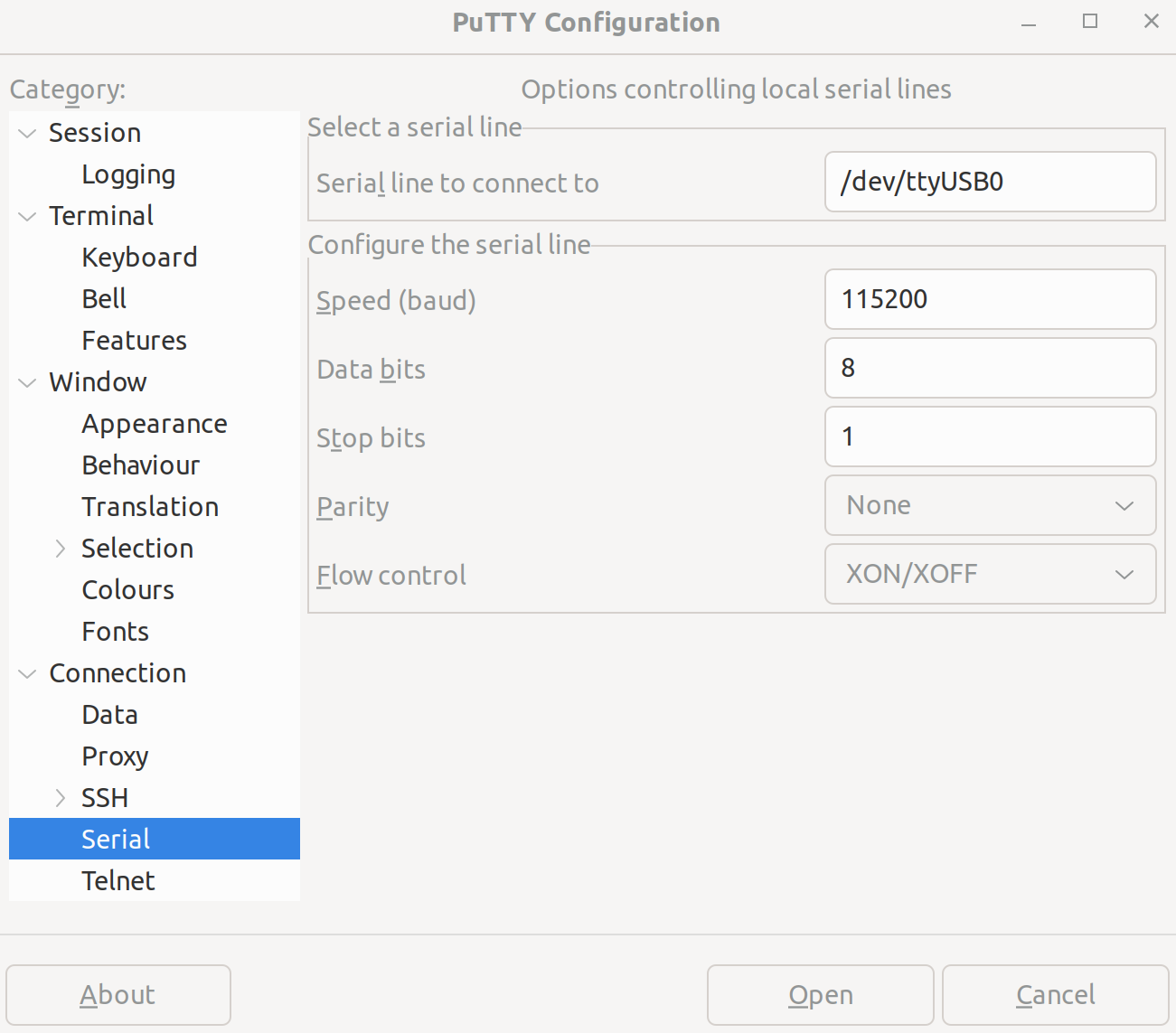 You should now be able to connect to the board using a serial communication program such as minicom or PuTTy. Use 8N1 (default parity settings) and a baudrate of 115200.